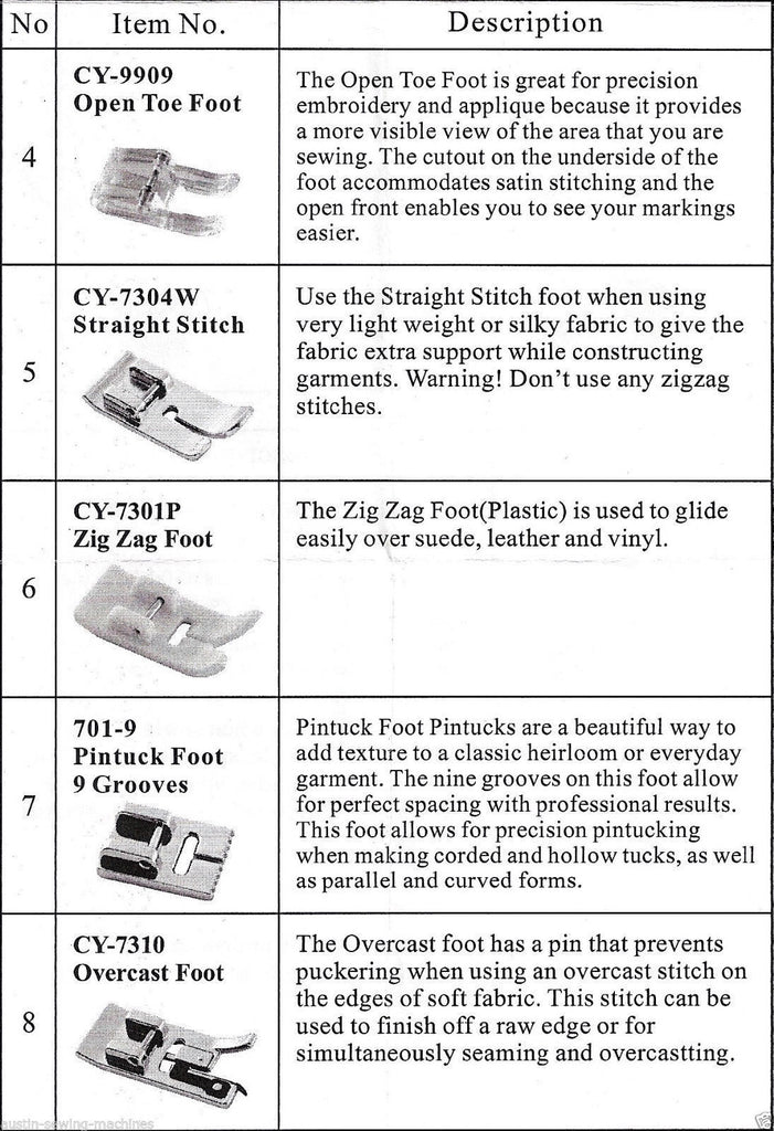 1. Diverse Selection of Presser Feet: With eight specialized presser feet, this kit covers a wide range of sewing tasks and techniques, making it suitable for sewers of all skill levels. From basic stitching to intricate embellishments, you'll have the right foot for every project.